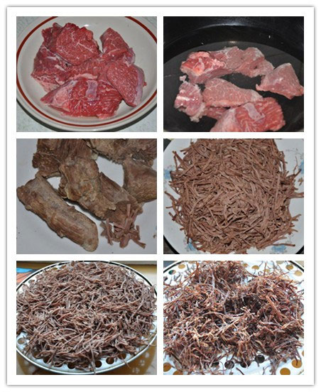 2.将撕好的肉丝摊开晾干。牛肉丝晾到半透明的时候收起,我是晚上晾的,第二天早晨就可以了。