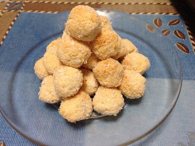 9.搓成大小均匀的小球,在椰丝(10g)里滚一下,使表面粘上一层。放在铺了锡纸或油纸的烤盘里,留有一点距离(搓小球前可以开烤箱预热)