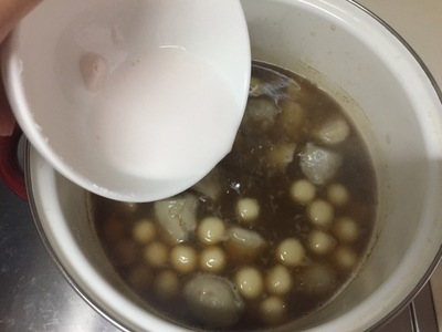 4.放入红糖煮开后,倒入小圆子,飘起来即为成熟。