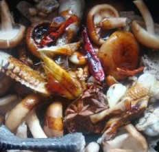 5.放入姜蒜,红椒,八角,依次再倒入料酒生抽,老抽,蚝油这些调料.