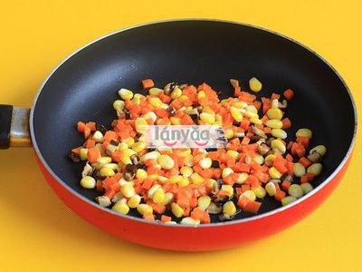 5.炒锅烧热放油,先加入胡萝卜和香菇略炒,再加入甜玉米翻炒均匀。