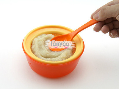 5.将释迦果泥放入滤勺中,用勺子再次压细腻。